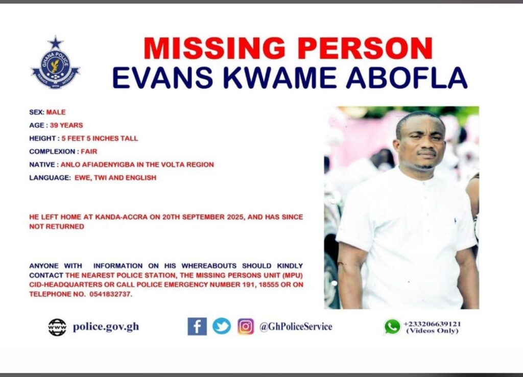 A 39-year-old man, Evans Kwame Abofla, has been reported missing after leaving his residence at Kanda, a suburb of Accra, on Saturday, September 20, 2025.