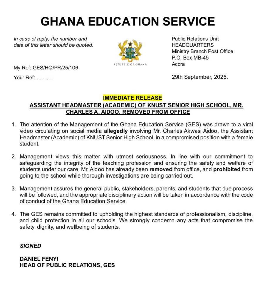 The Ghana Education Service (GES) has removed the Assistant Headmaster of KNUST Senior High School, Mr. Charles Akwasi Aidoo, following the emergence of a viral video allegedly showing him in a compromising situation with a female student.