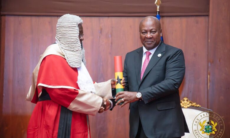 The ceremony, held at the Jubilee House, follows Parliament’s approval of his nomination last week and fills the vacancy created by the dismissal of former Chief Justice Gertrude Torkonoo.