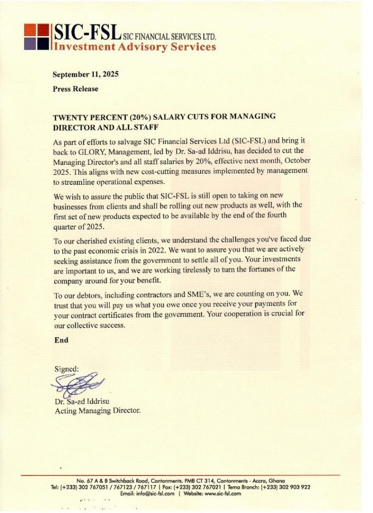 In a press release dated September 11, Dr. Sa-ad Iddrisu said “this salary reduction is a necessary sacrifice we are making to ensure the survival and eventual recovery of SIC-FSL. Our commitment to our clients, staff, and stakeholders remains unwavering.”